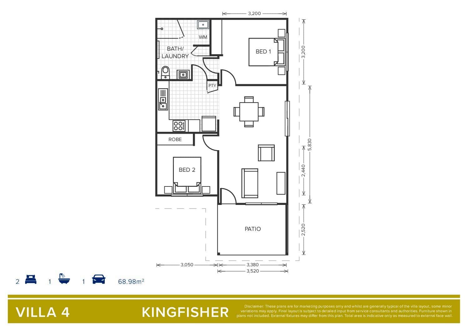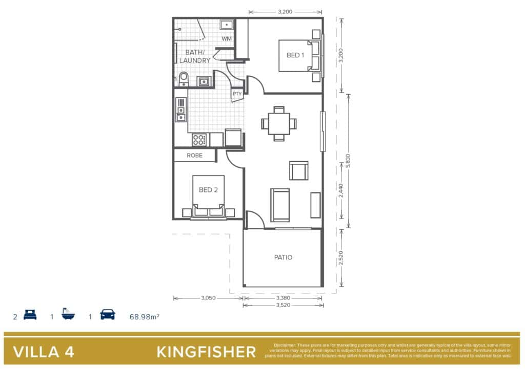 Villa 4 is a thoughtfully designed, low-maintenance home offering one bathroom and two spacious bedrooms, with built-in storage. A generous kitchen flows seamlessly into a spacious dining and lounge area, with access to a patio, creating an open and inviting environment for everyday living and entertaining.