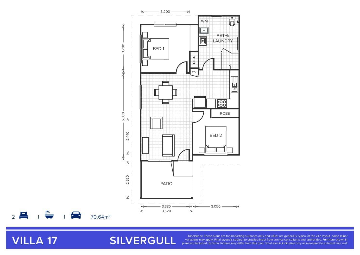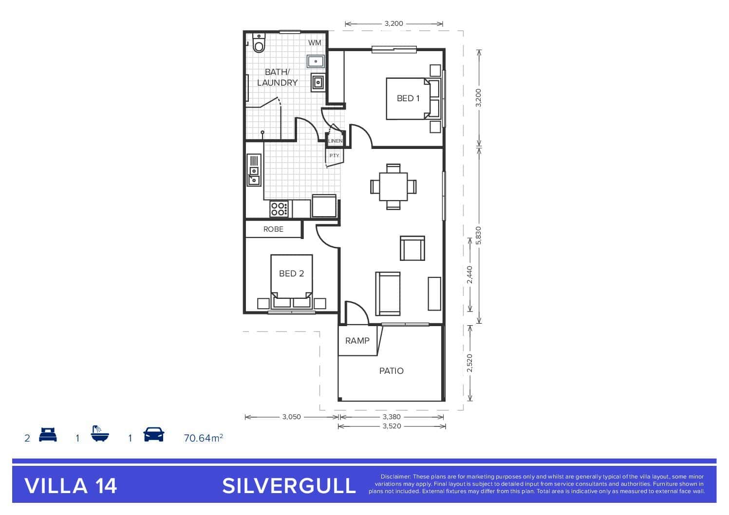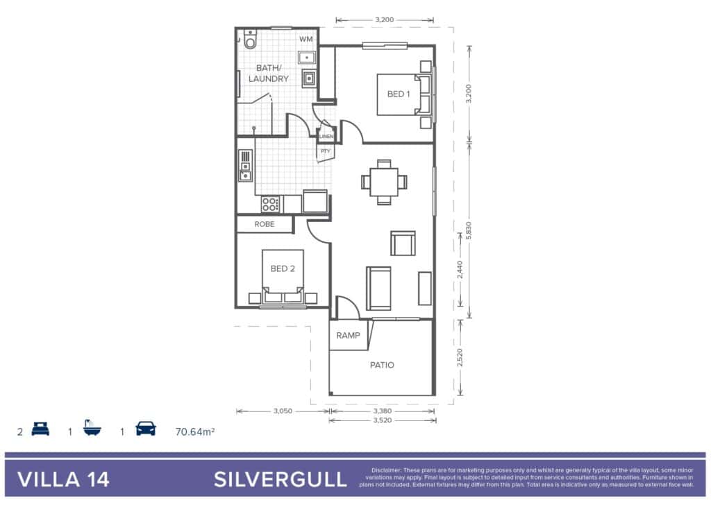Located on the outer edge of the village, Villa 14 is a thoughtfully designed, low-maintenance home offering one bathroom and two spacious bedrooms, with built-in storage. A generous kitchen flows seamlessly into a spacious dining and lounge area, with access to a patio, creating an open and inviting environment for everyday living and entertaining.